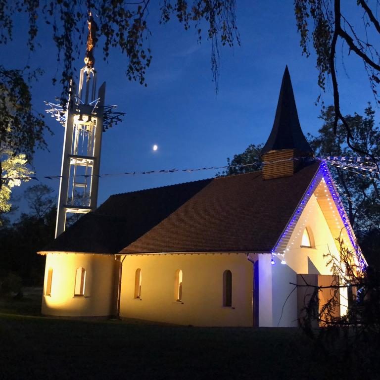 Cette chapelle, inspirée des chapelles et églises de nos campagnes est représentative en fait de toutes les chapelles qui fleurissent dans nos terroirs à la gloire de Marie. Plus proche de l’architecture du nord de la France avec son clocheton, ses absides, son préau, ses fenêtres en ogive, elle peut accueillir 140 personnes.